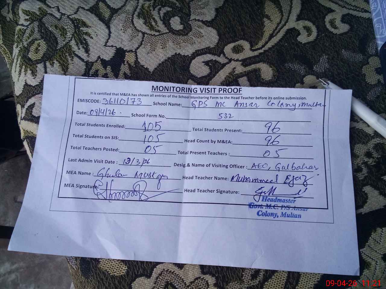 | EMIS Code: 36110173 | Name of School: GPS MC ANSAR COLONY BUDHLA ROAD MULTAN | |||