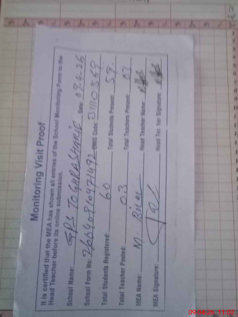 | Attendance Register | Head Teacher | MEA with School | Visit Proof |