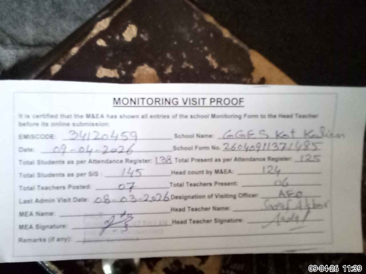 | Attendance Register | Head Teacher | MEA with School | Visit Proof |