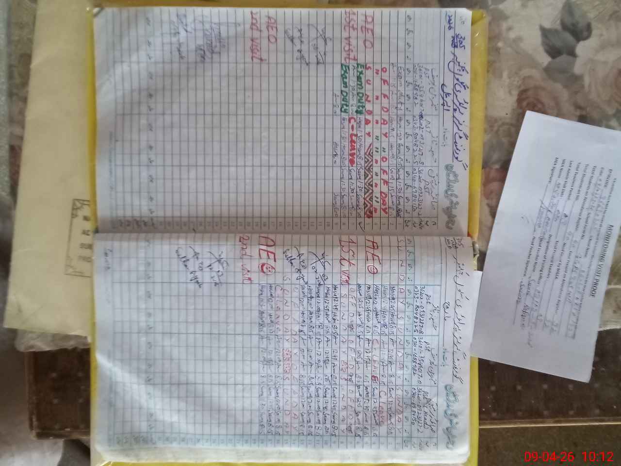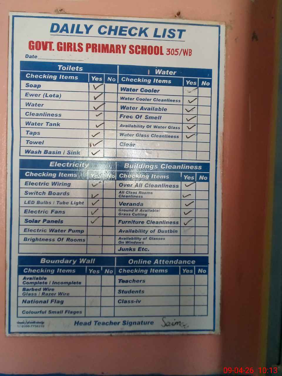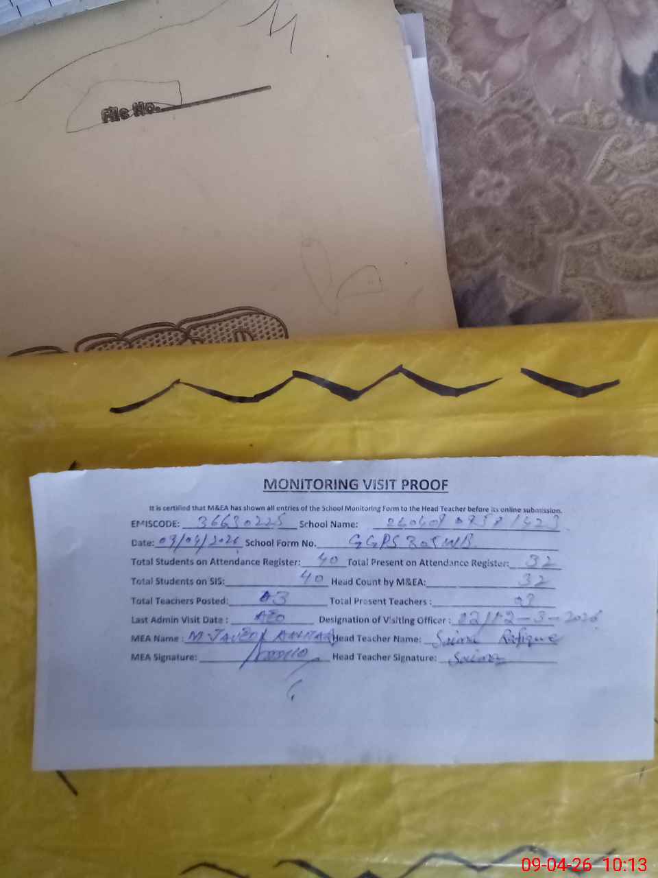 | Attendance Register | Head Teacher | MEA with School | Visit Proof |