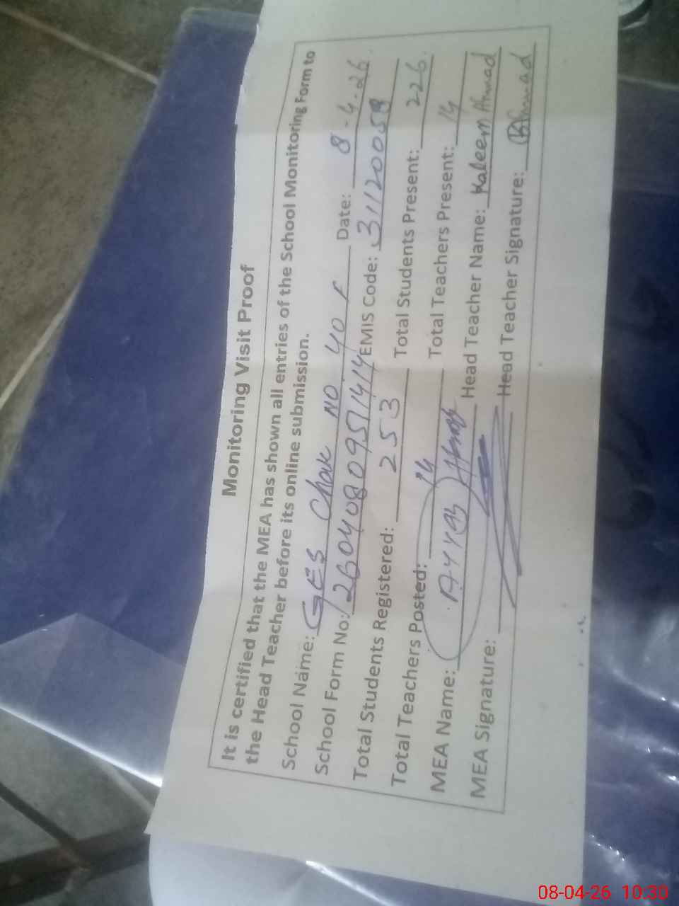 | Attendance Register | Head Teacher | MEA with School | Visit Proof |