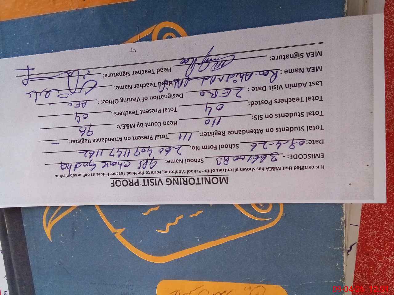 | Attendance Register | Head Teacher | MEA with School | Visit Proof |