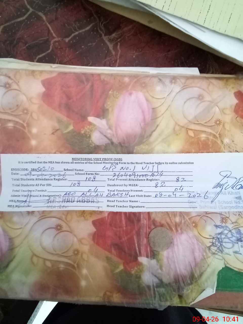 | Attendance Register | Head Teacher | MEA with School | Visit Proof |