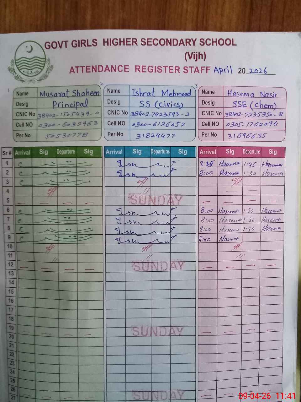 | CNIC | Full Name | Designation | R/C | Absence during last cal. month |