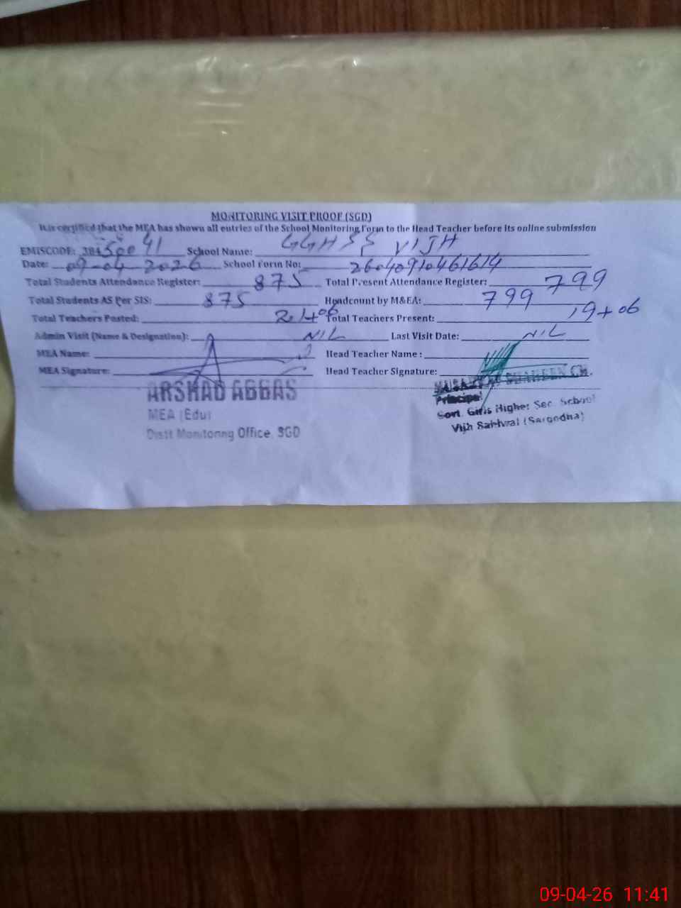 | Attendance Register | Head Teacher | MEA with School | Visit Proof |