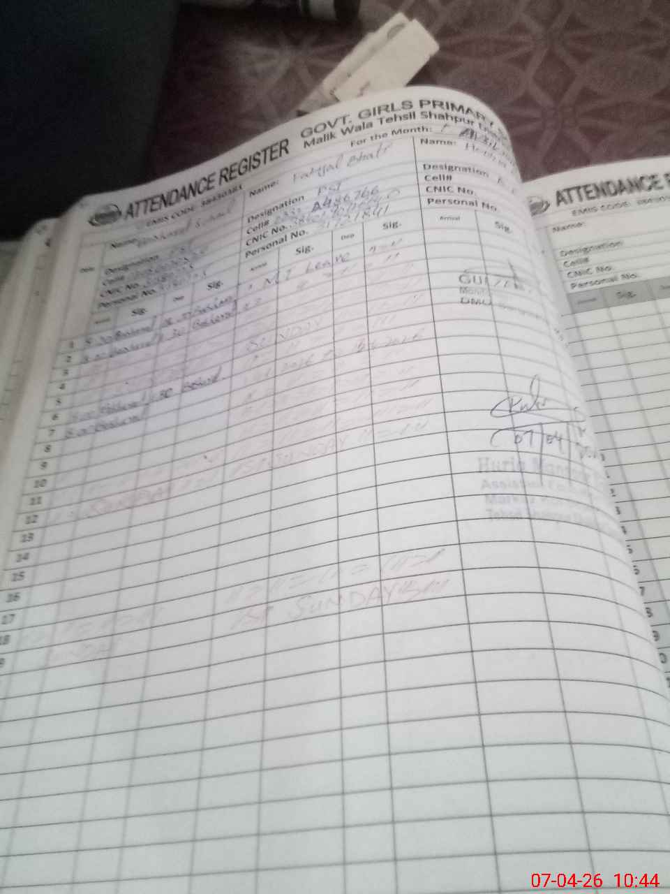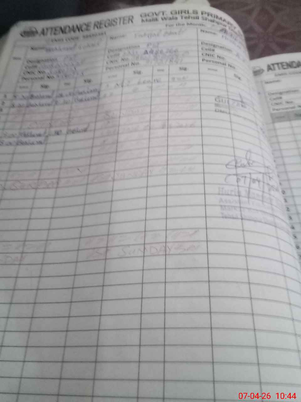 | CNIC | Full Name | Designation | R/C | Absence During Last Calender Month |