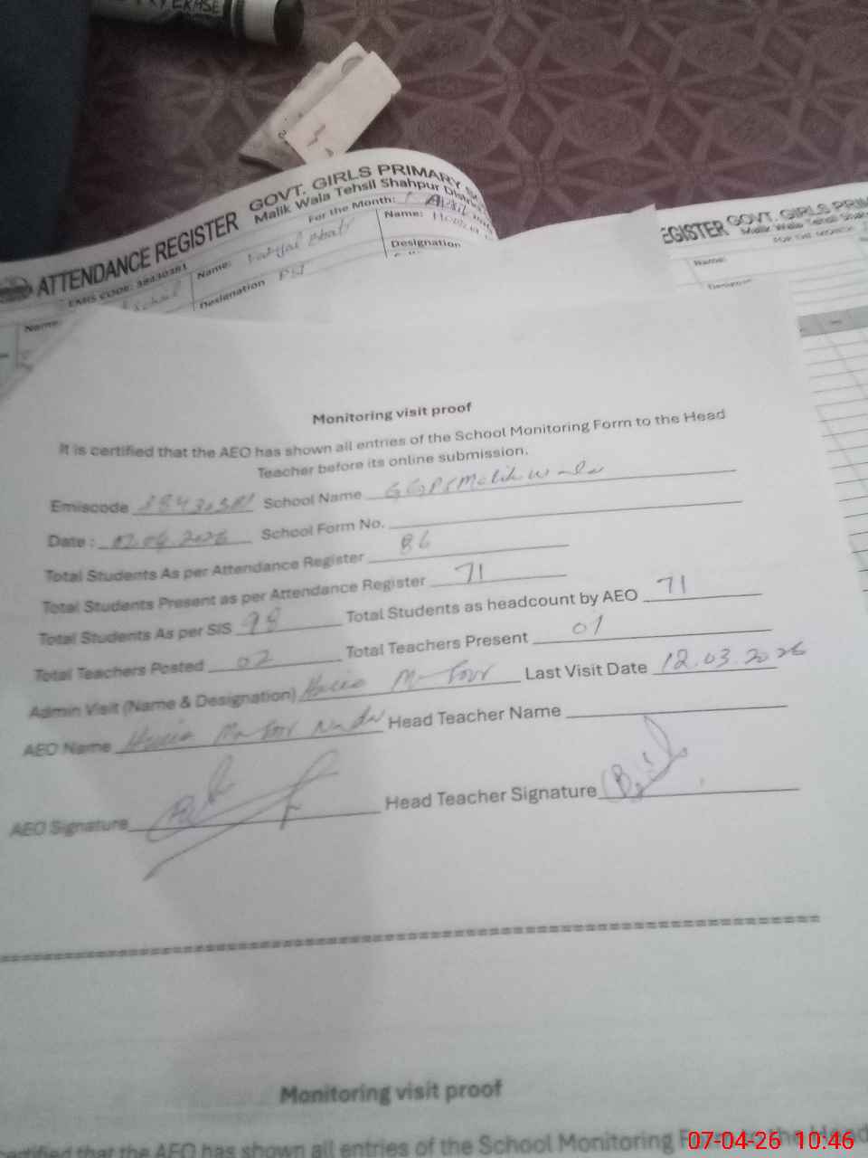 | Attendance Register | Head Teacher | MEA with School | Visit Proof |