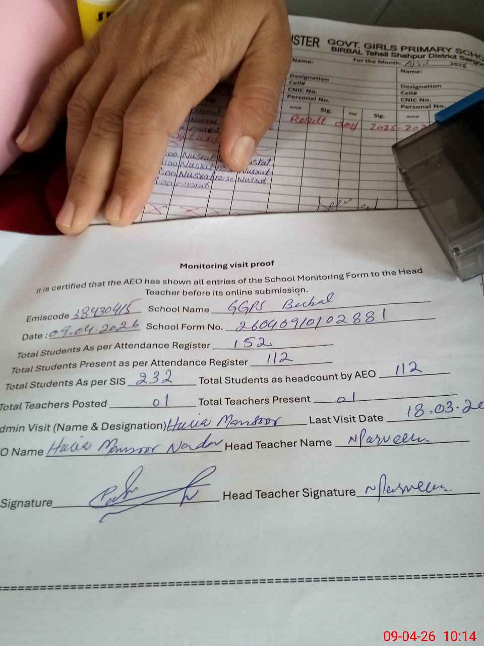 | Attendance Register | Head Teacher | MEA with School | Visit Proof |