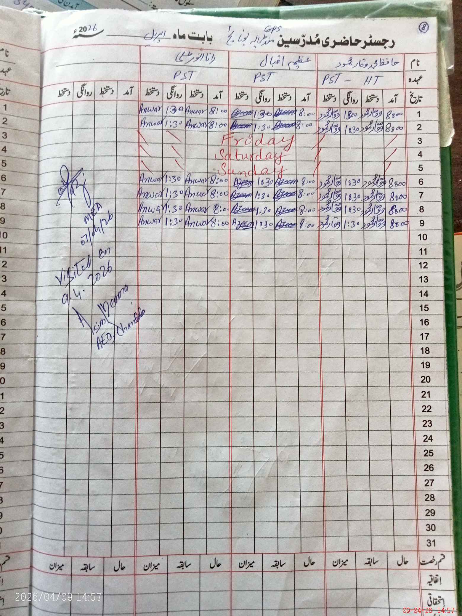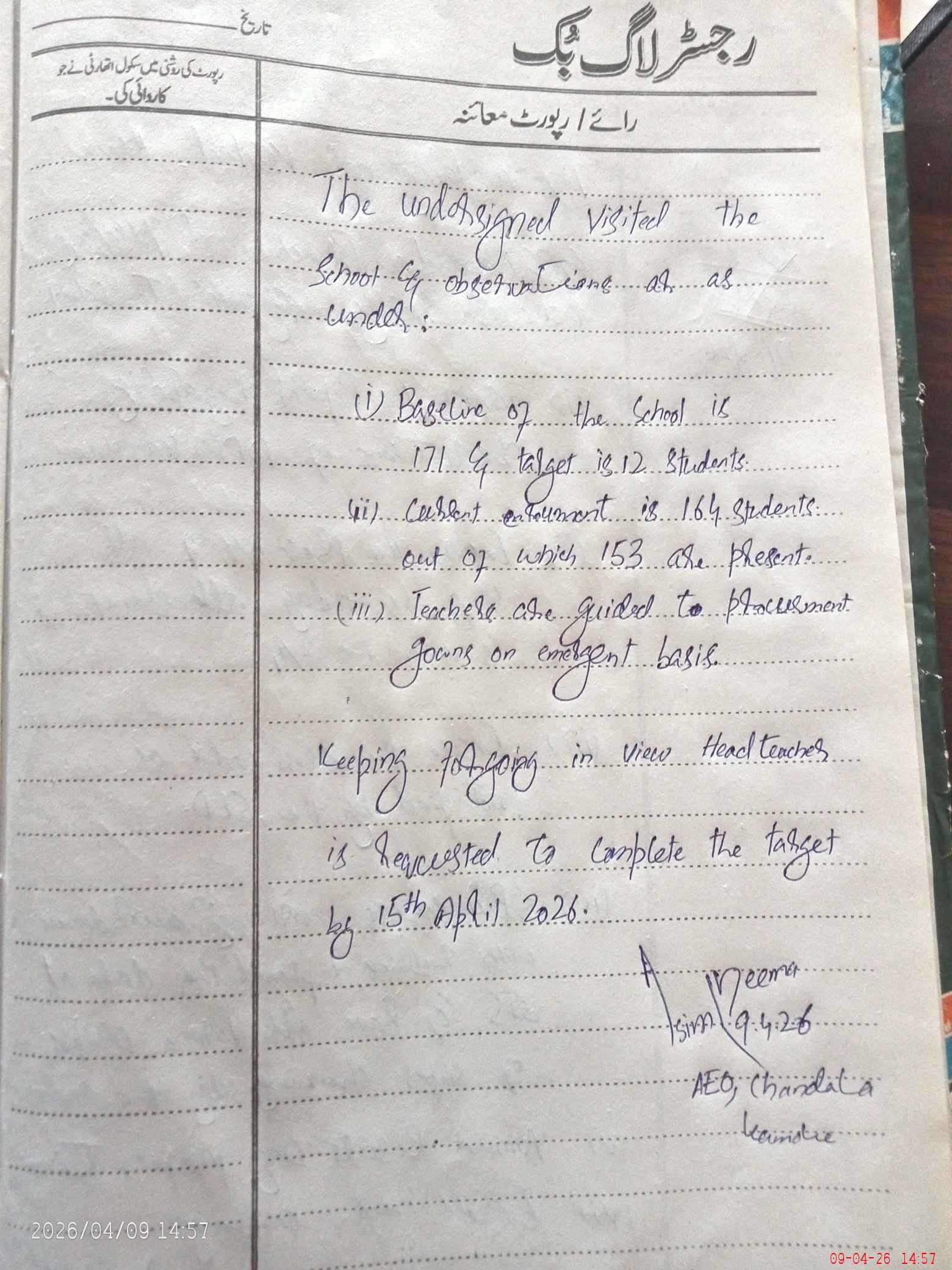 | Attendance Register | Head Teacher | MEA with School | Visit Proof |