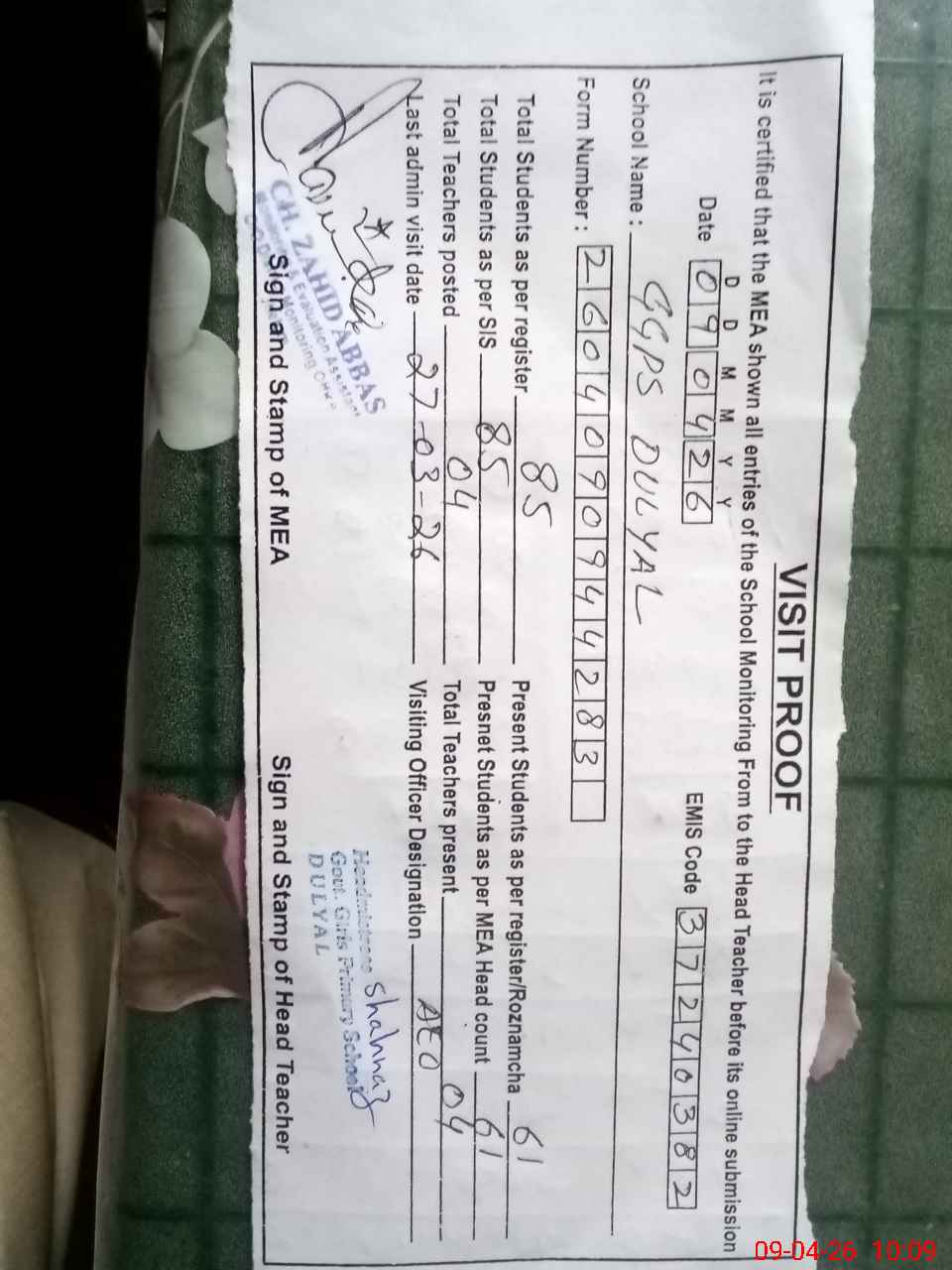 | Attendance Register | Head Teacher | MEA with School | Visit Proof |