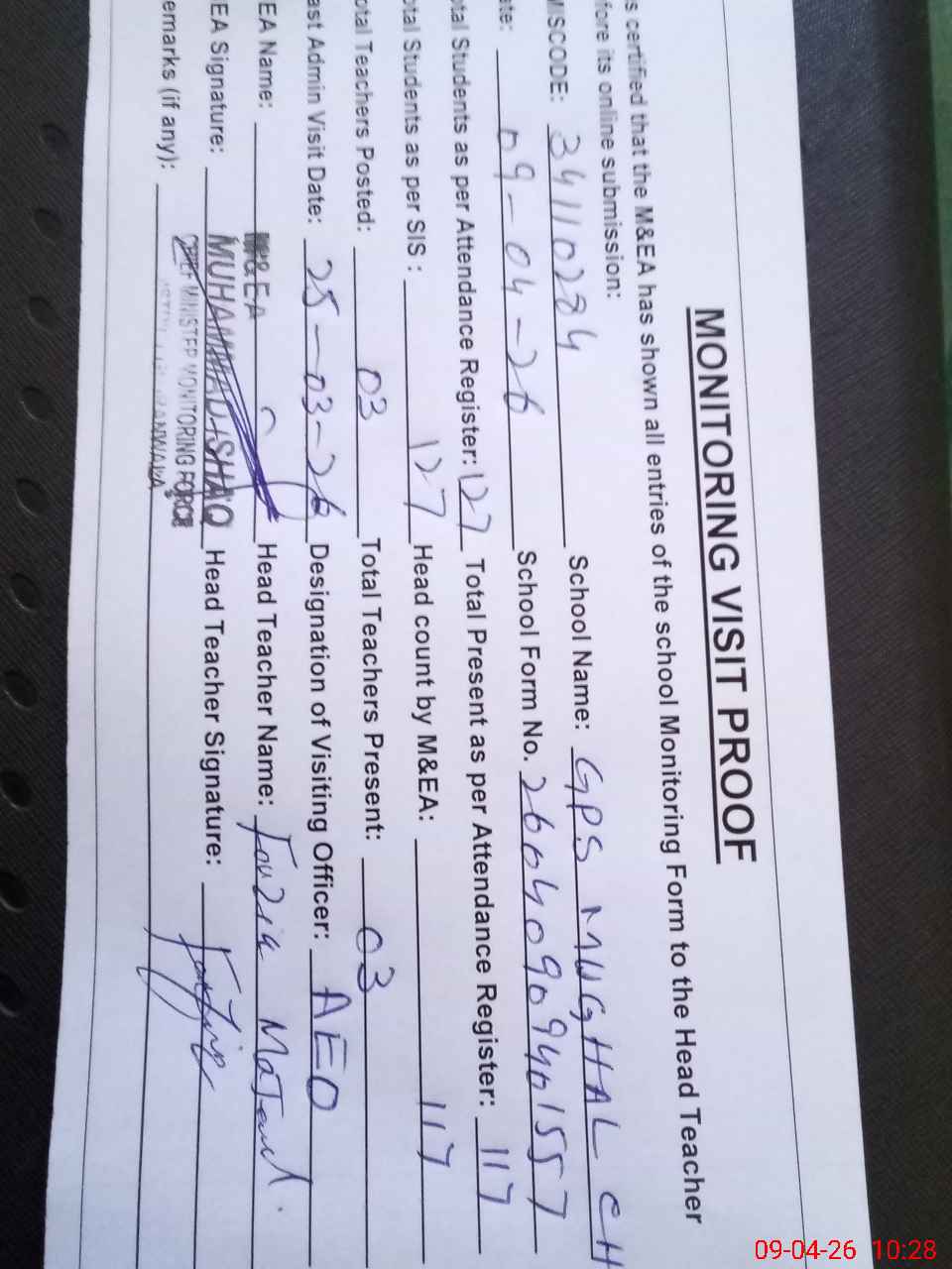 | Attendance Register | Head Teacher | MEA with School | Visit Proof |
