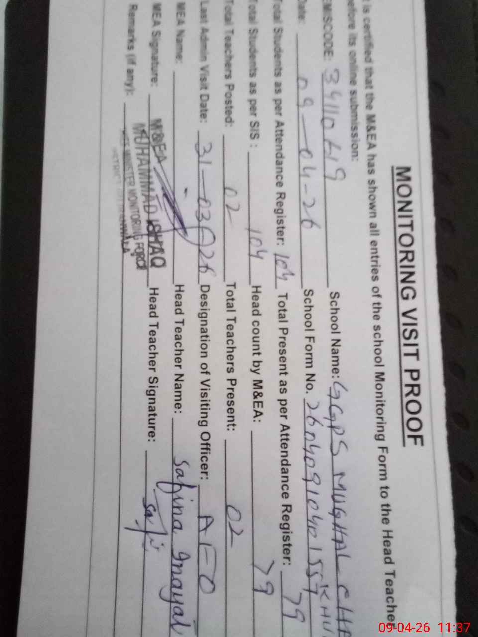 | Attendance Register | Head Teacher | MEA with School | Visit Proof |