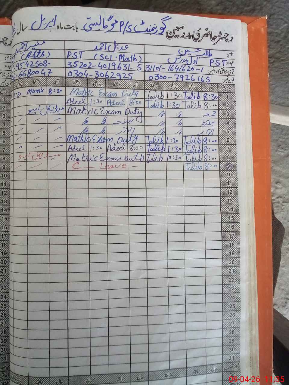 | Leave | Duty | Absent | Maternity | Medical | Ex- Pak |