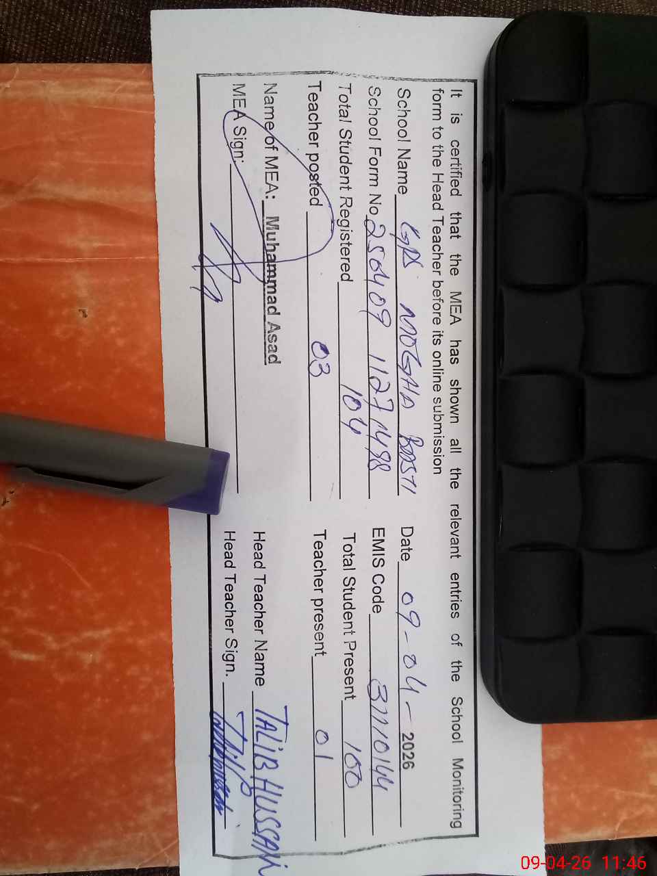 | Attendance Register | Head Teacher | MEA with School | Visit Proof |