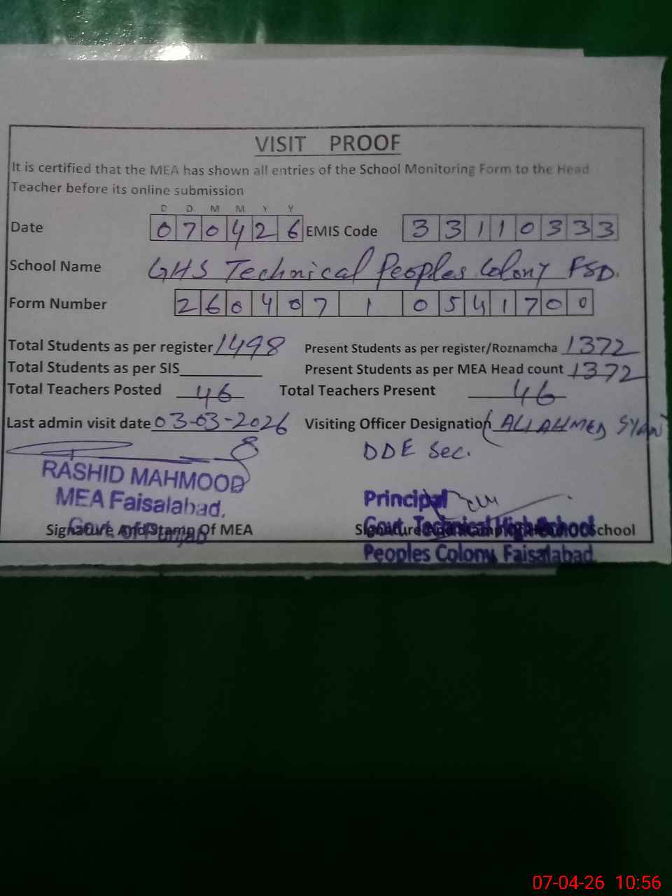 | EMIS Code: 33110333 | Name of School: GHS TECHNICAL PEOPLES COLONY FSD | |||