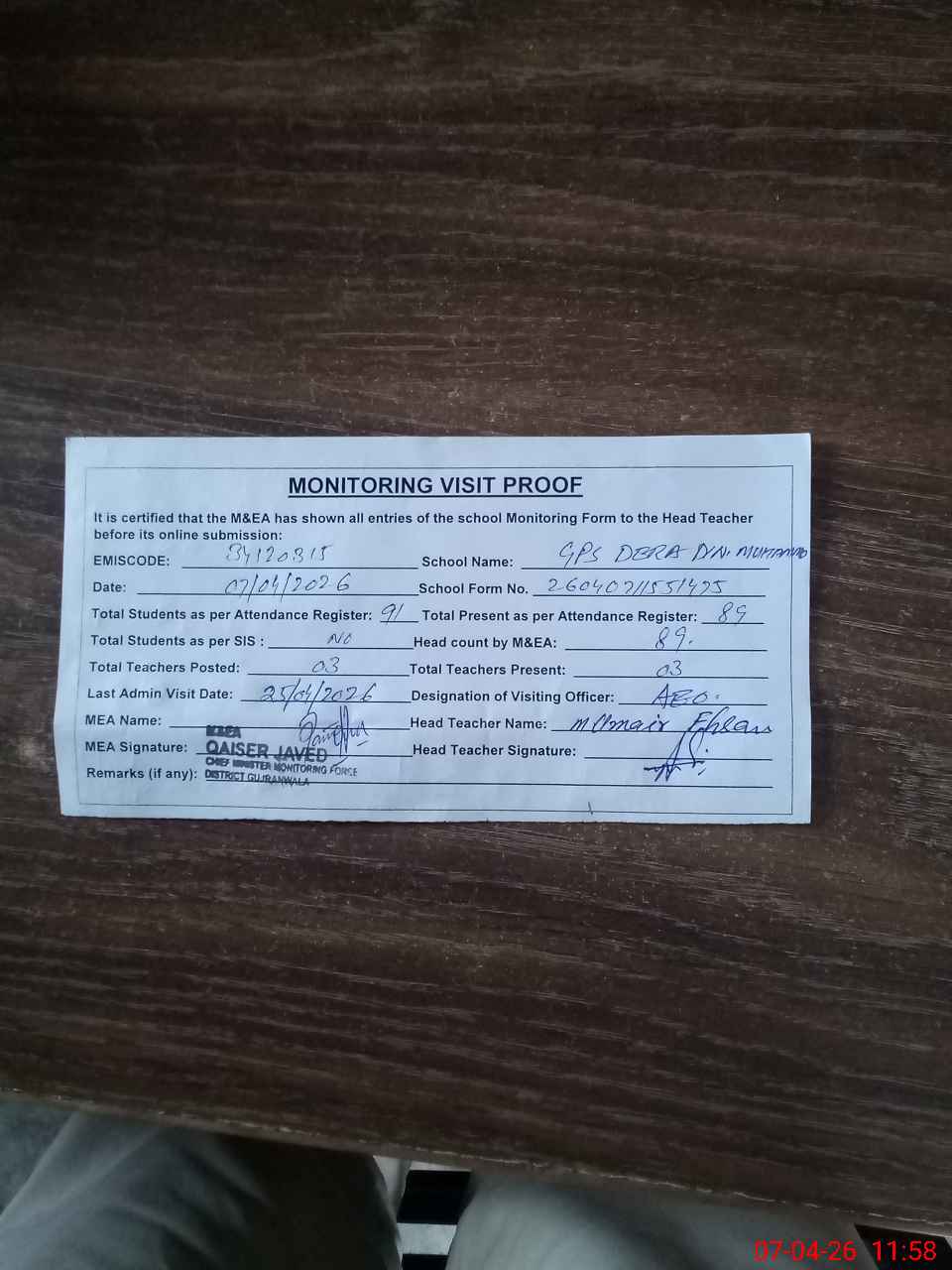 | Attendance Register | Head Teacher | MEA with School | Visit Proof |