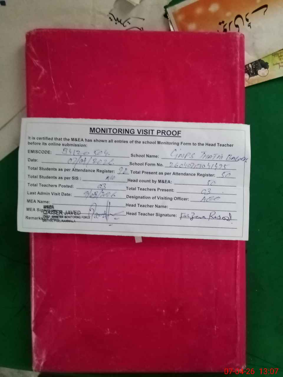 | Attendance Register | Head Teacher | MEA with School | Visit Proof |