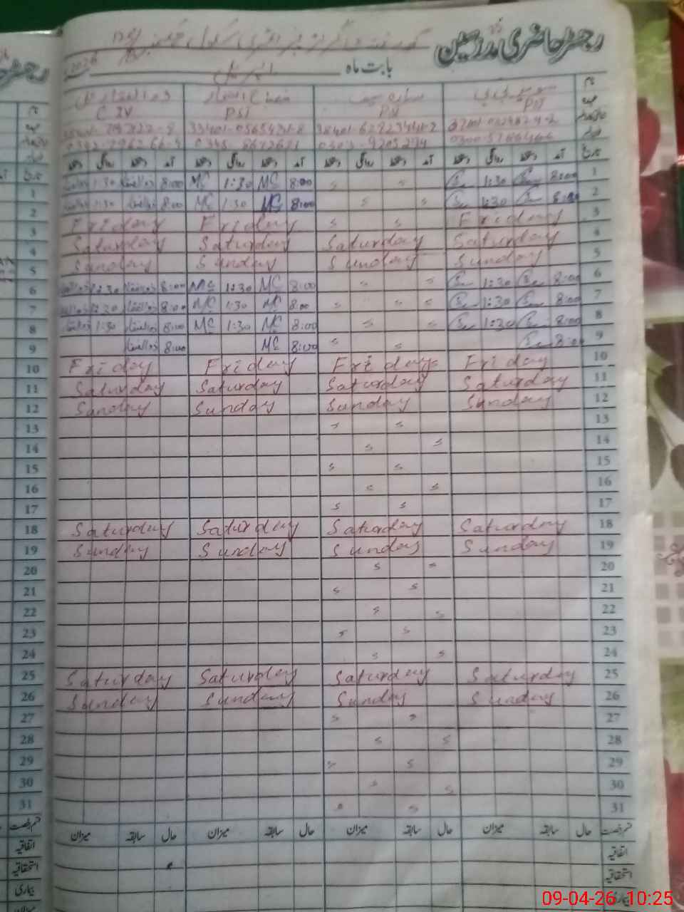 | CNIC | Full Name | Designation | R/C | Absence During Last Calender Month |