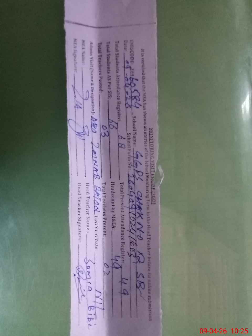 | Attendance Register | Head Teacher | MEA with School | Visit Proof |