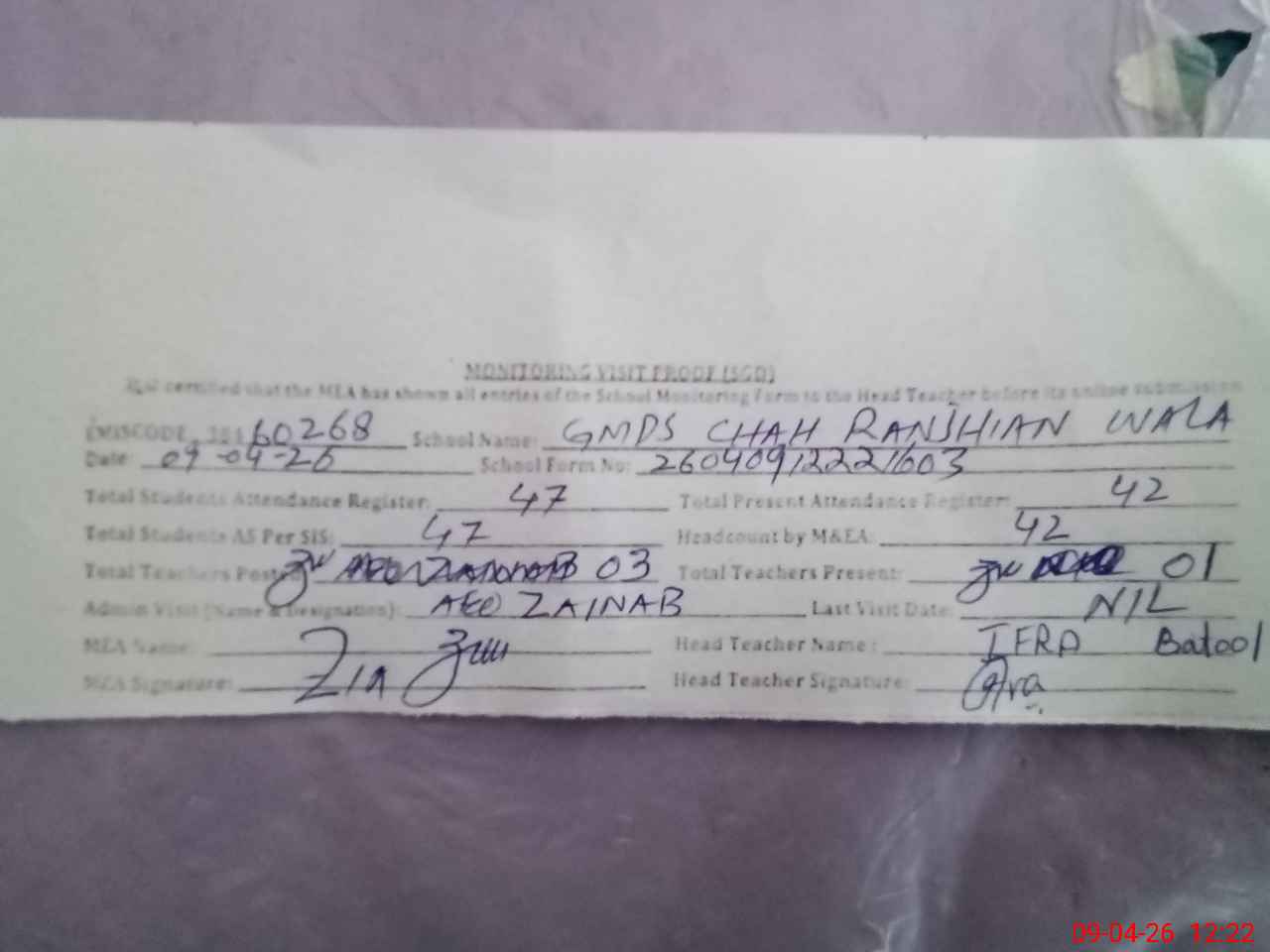 | Attendance Register | Head Teacher | MEA with School | Visit Proof |