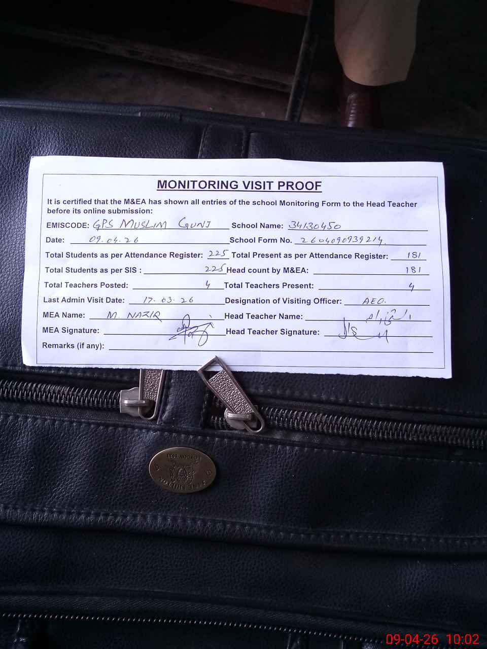 | Attendance Register | Head Teacher | MEA with School | Visit Proof |