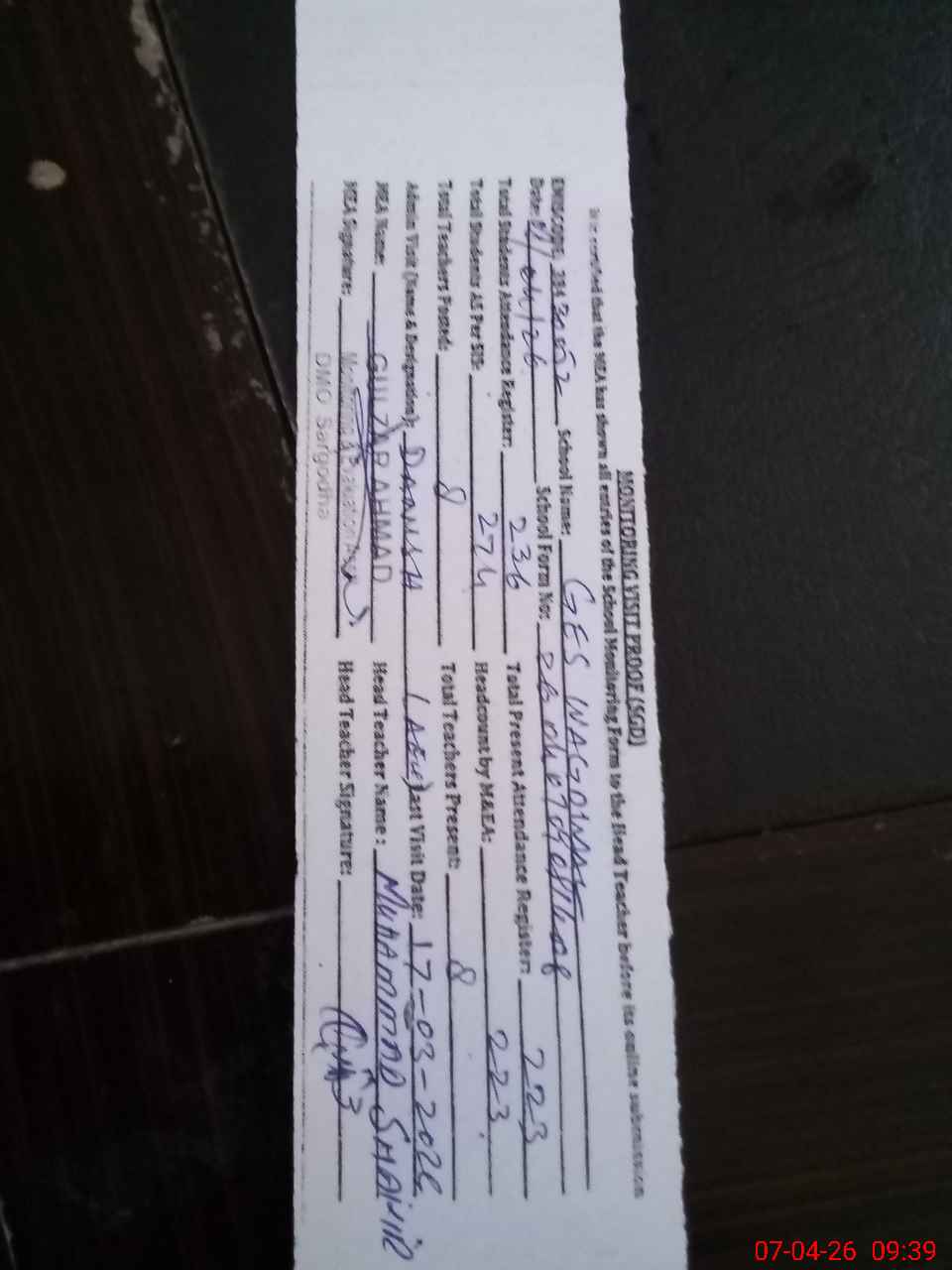 | Attendance Register | Head Teacher | MEA with School | Visit Proof |
