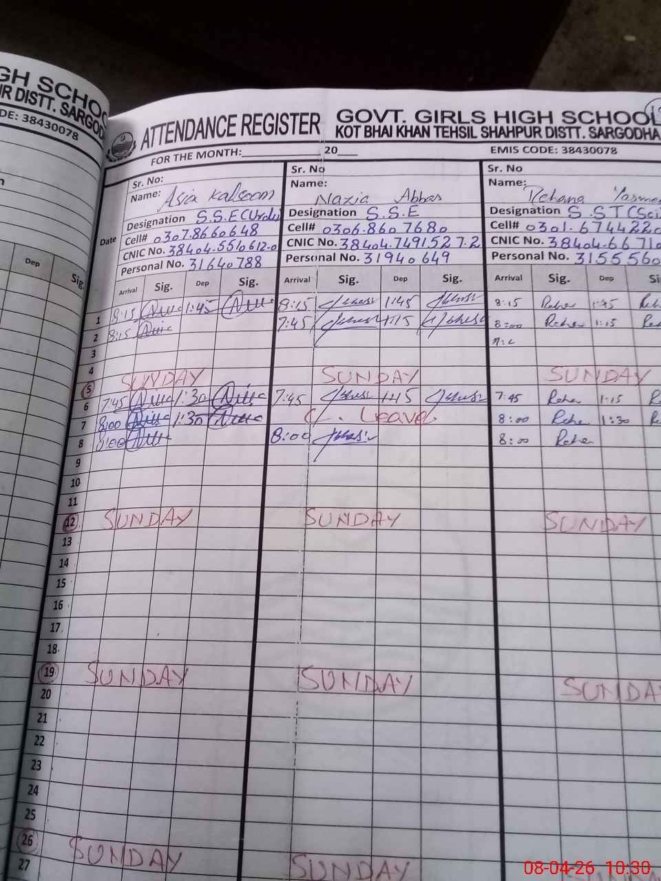| CNIC | Full Name | Designation | R/C | Absence During Last Calender Month |