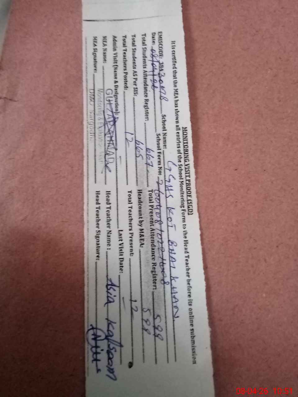| Attendance Register | Head Teacher | MEA with School | Visit Proof |