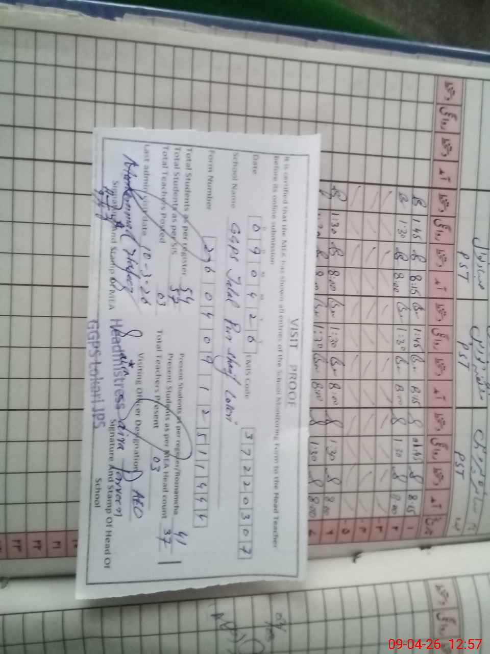 | Attendance Register | Head Teacher | MEA with School | Visit Proof |