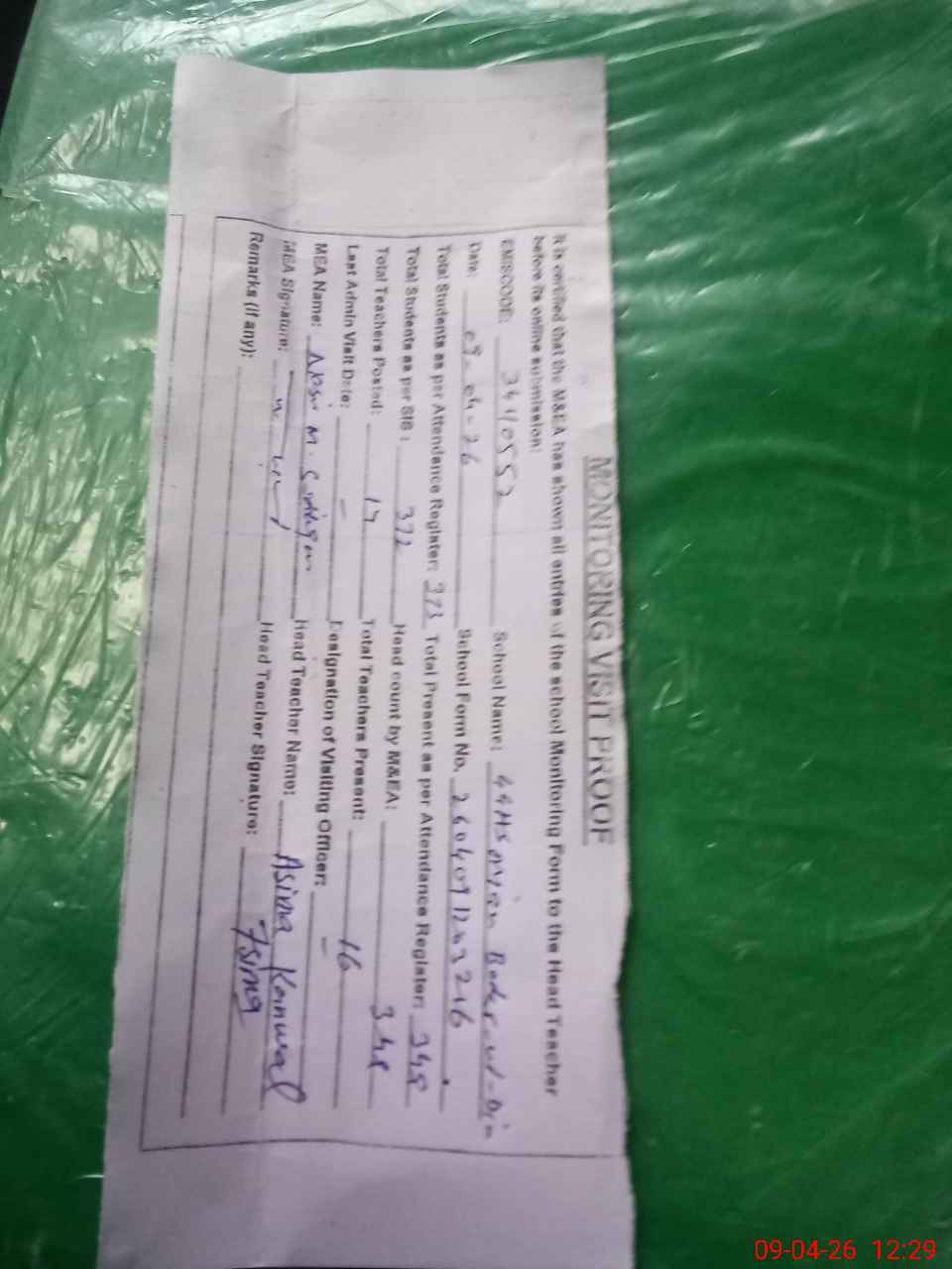 | Attendance Register | Head Teacher | MEA with School | Visit Proof |