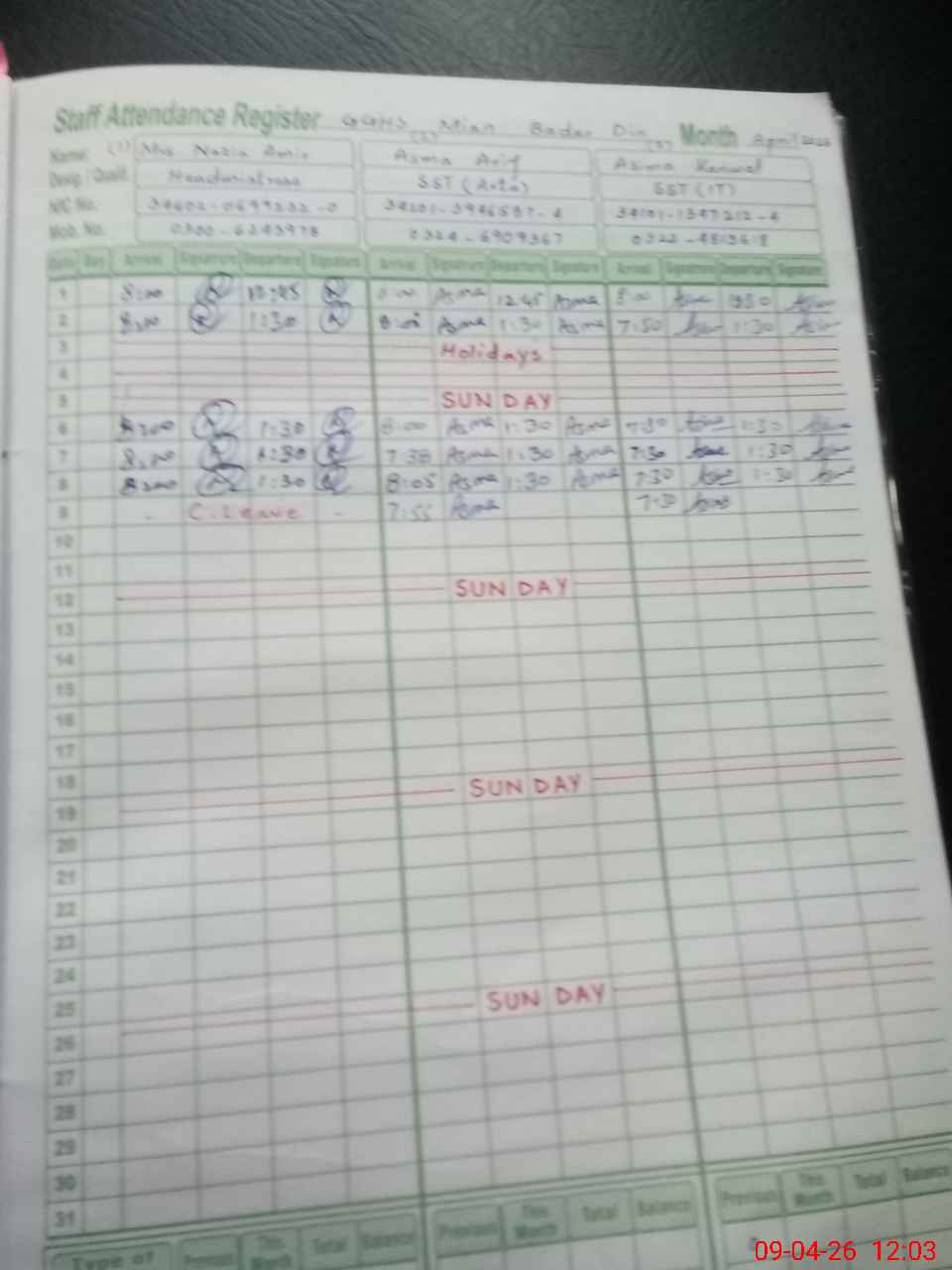 | CNIC | Full Name | Designation | R/C | Absence During Last Calender Month |