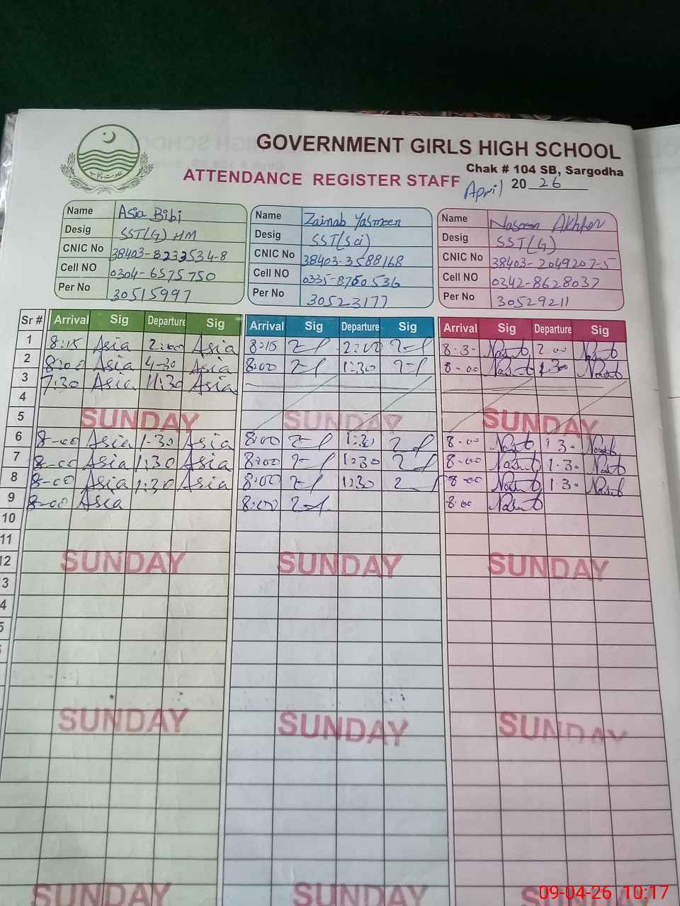 | CNIC | Full Name | Designation | R/C | Absence During Last Calender Month |