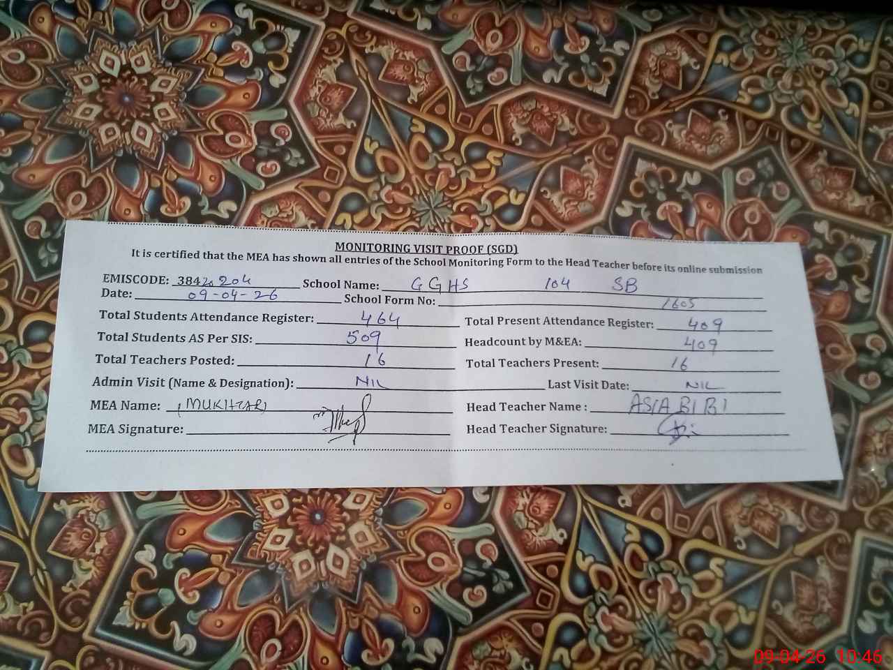 | Monitoring Date: 09-04-2026 | Start Time: 09-04-2026 10:07 AM | End Time: 09-04-2026 10:49 AM | Name of MEA: MU**** AH**** | |