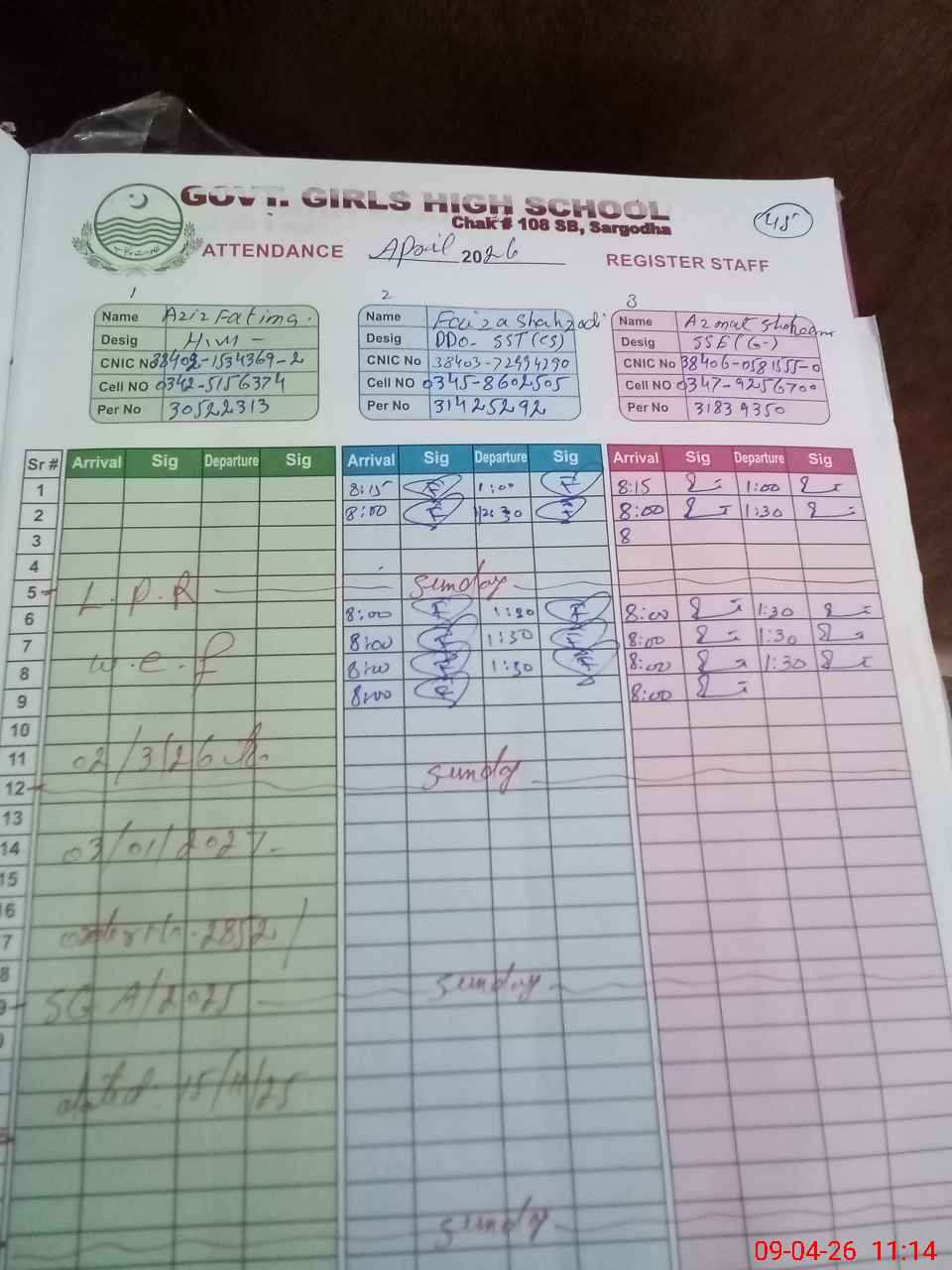 | CNIC | Full Name | Designation | R/C | Absence during last cal. month |