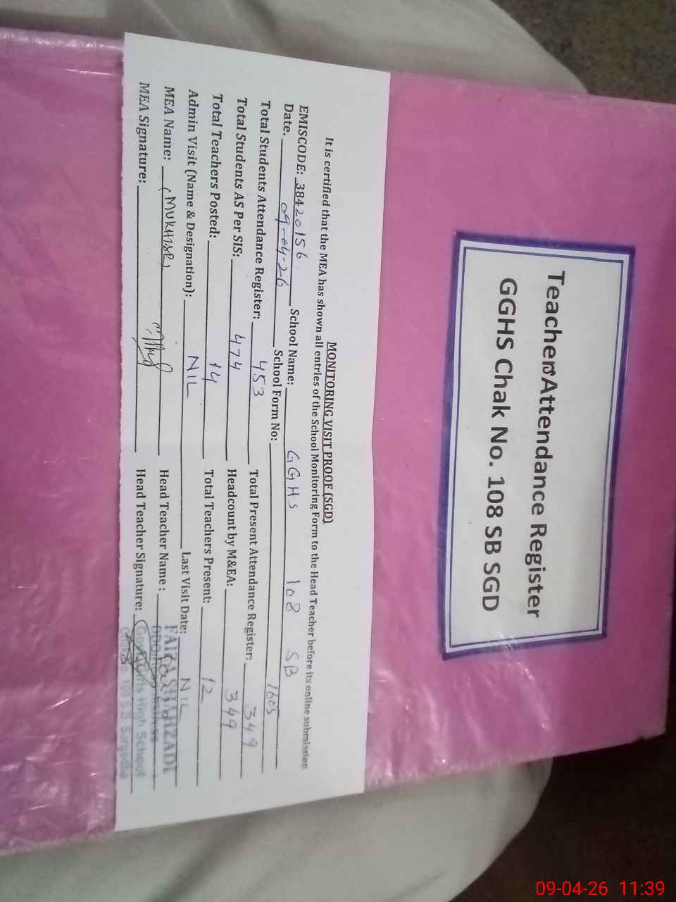 | EMIS Code: 38420156 | Name of School: GGHS CHAK NO.108 SB | |||