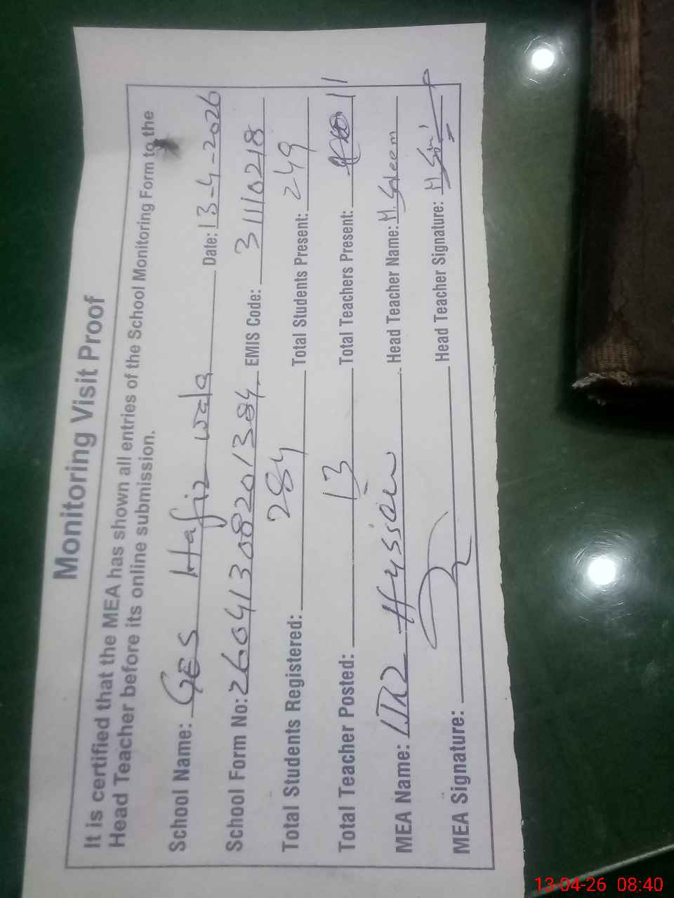 | Attendance Register | Head Teacher | MEA with School | Visit Proof |