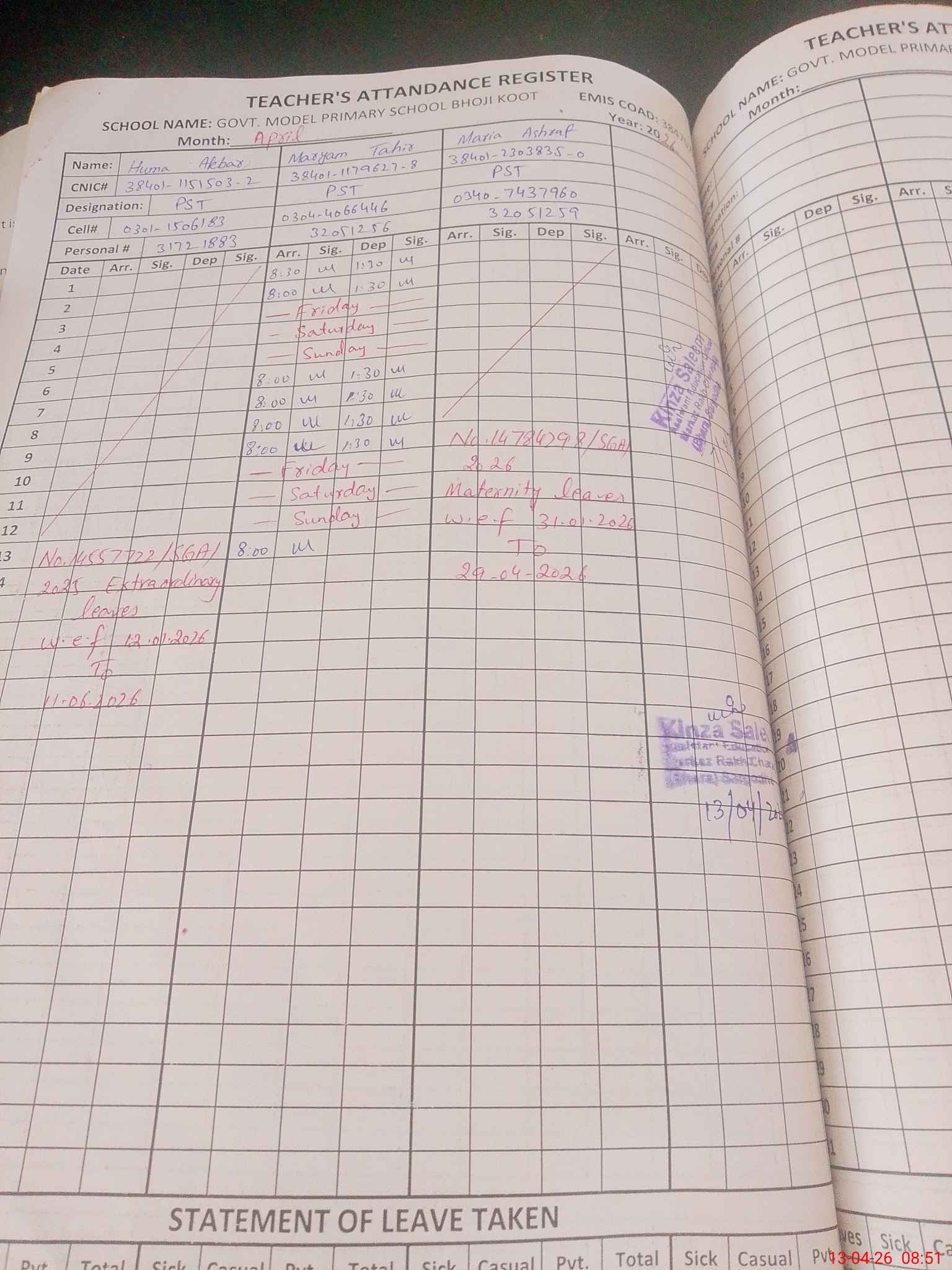 | 38**** | Ma**** As**** | PST Science/Maths | Regular | 0 | 0 | 0 | 0 | 0 | 0 | 0 | 0 | 0 | Maternity |