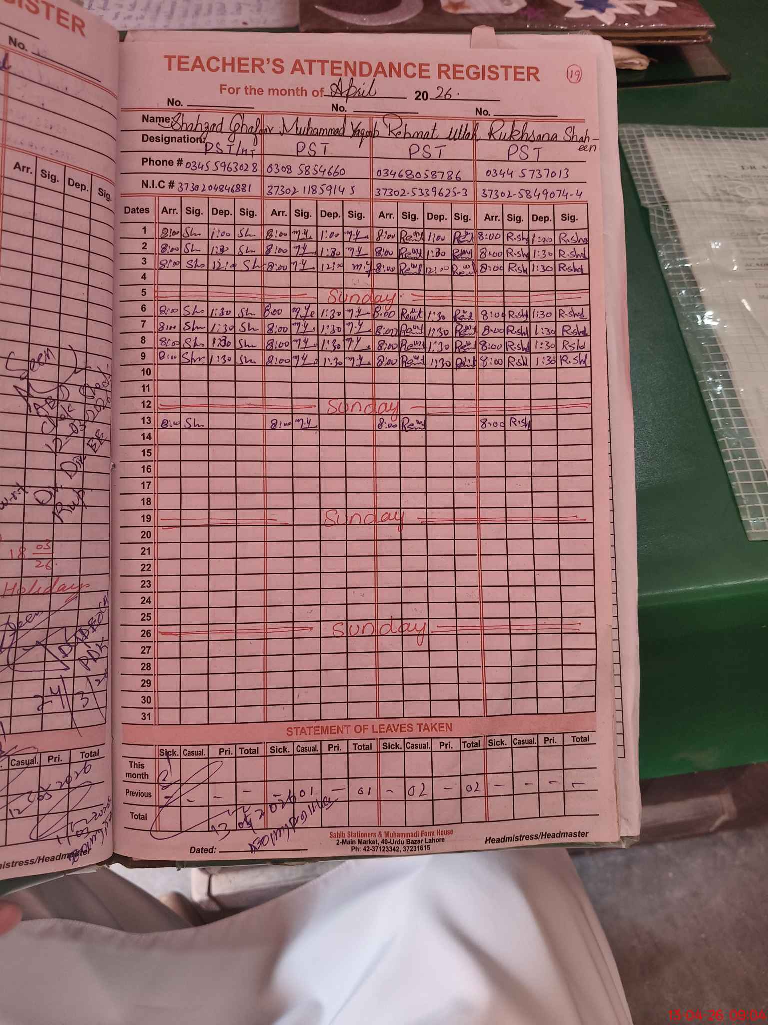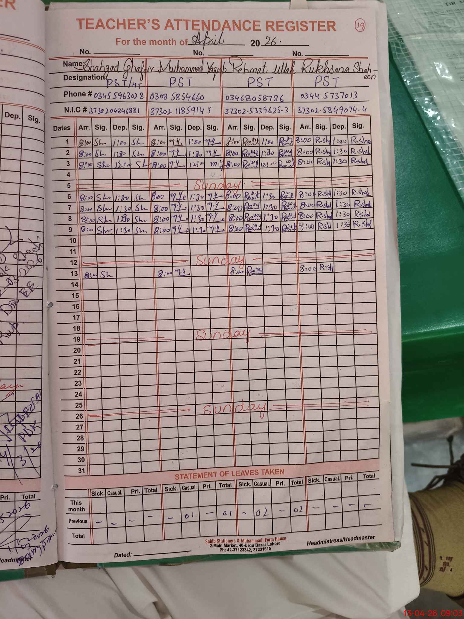 | CNIC | Full Name | Designation | R/C | Absence During Last Calender Month |