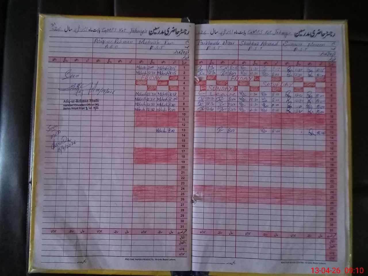 | CNIC | Full Name | Designation | R/C | Absence During Last Calender Month |