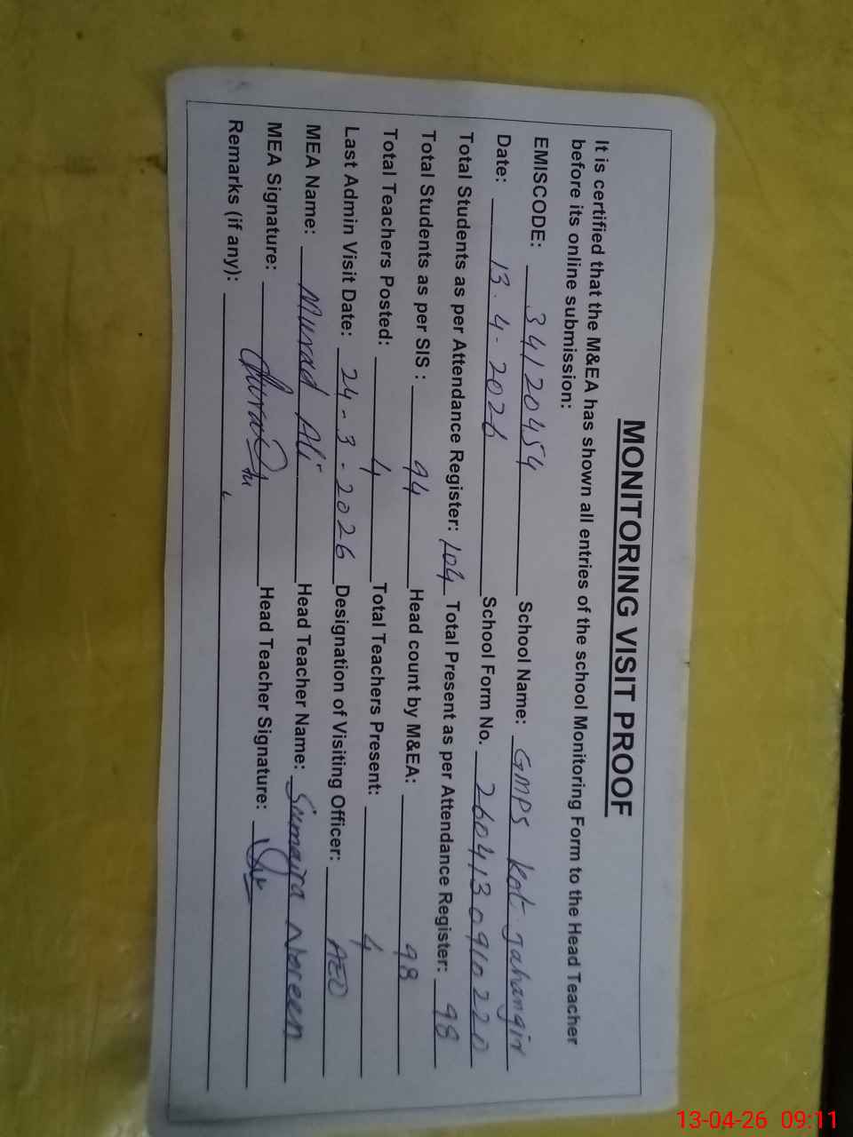 | Attendance Register | Head Teacher | MEA with School | Visit Proof |