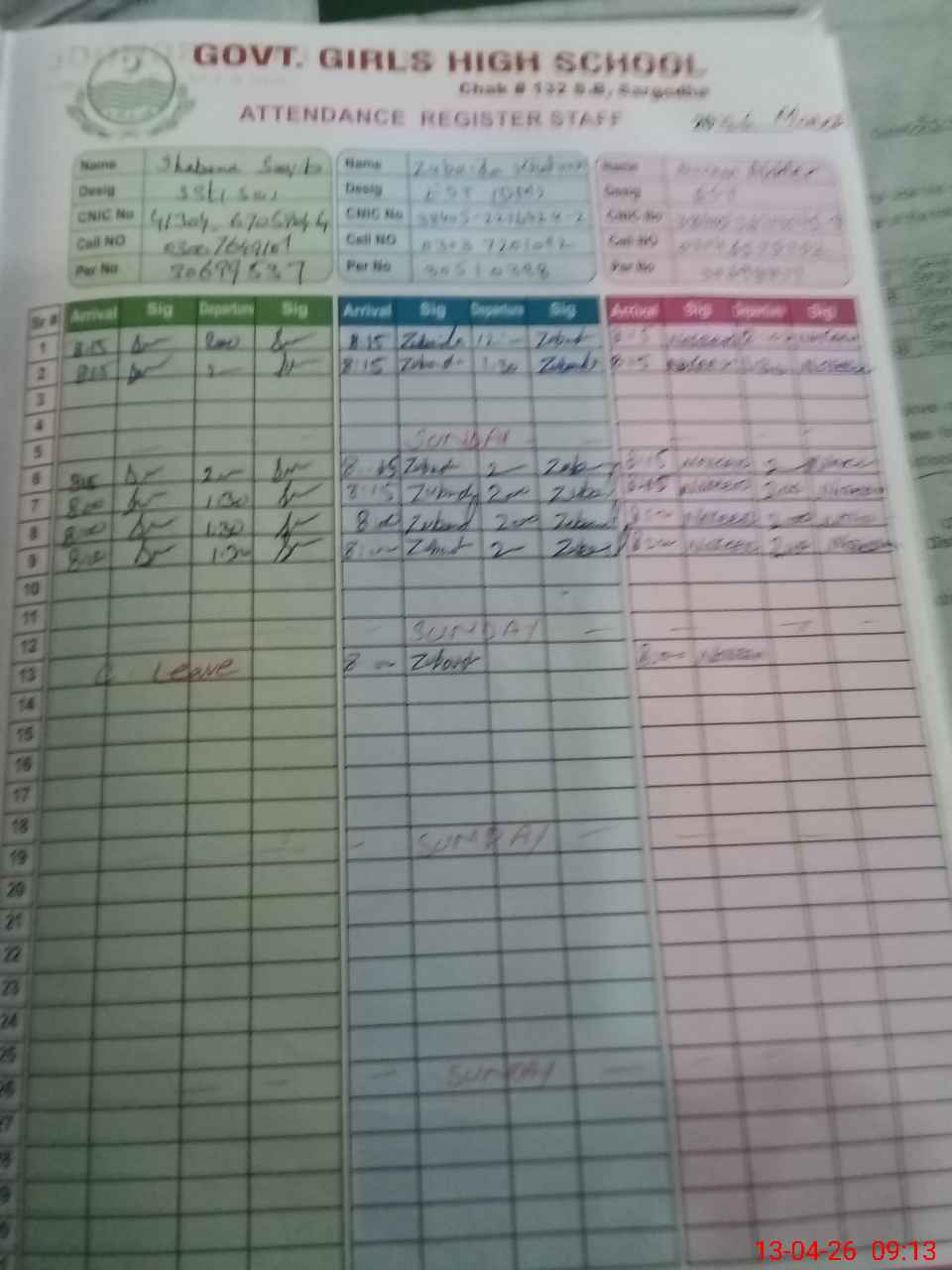 | CNIC | Full Name | Designation | R/C | Absence During Last Calender Month |