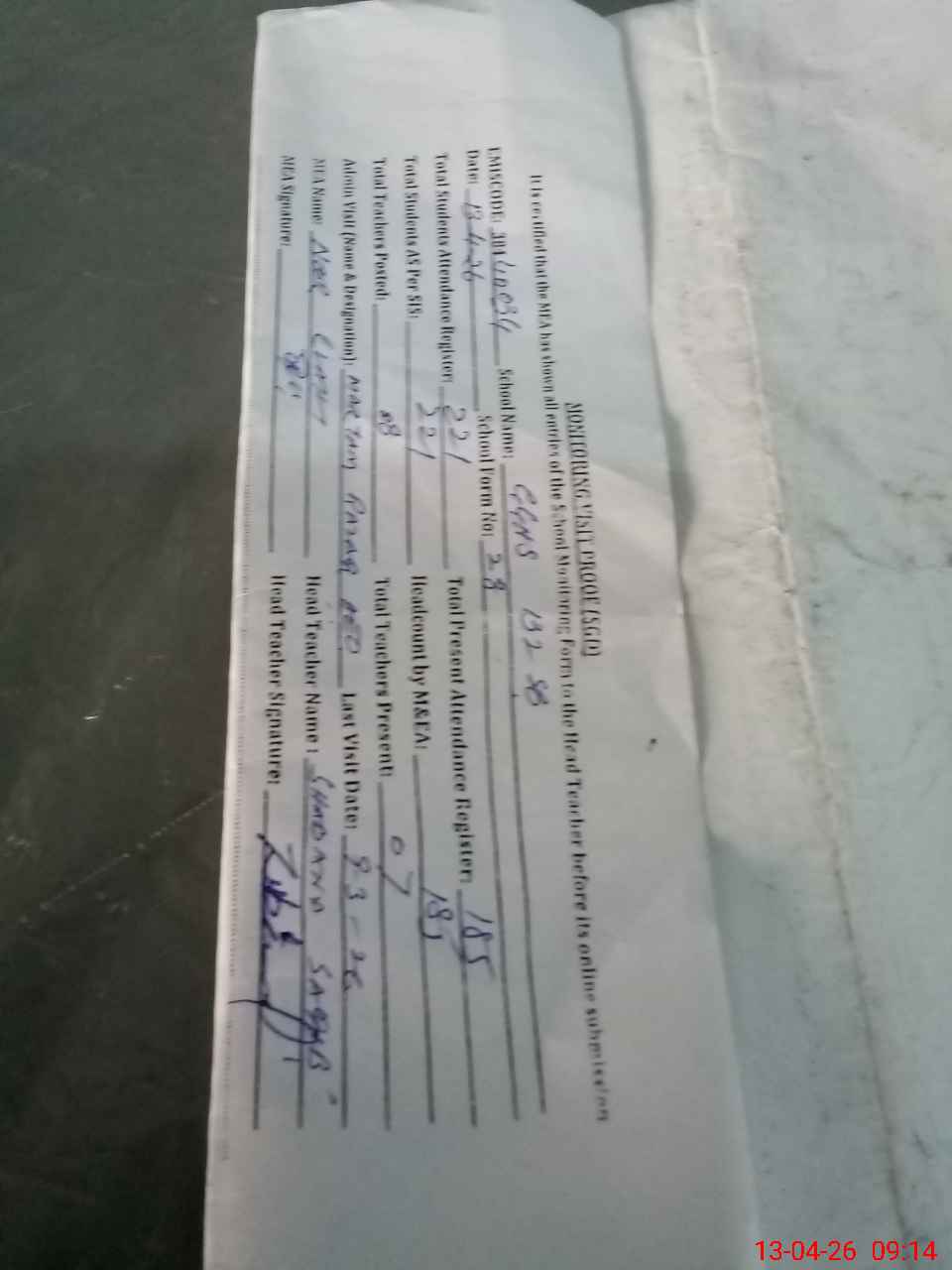 | Attendance Register | Head Teacher | MEA with School | Visit Proof |