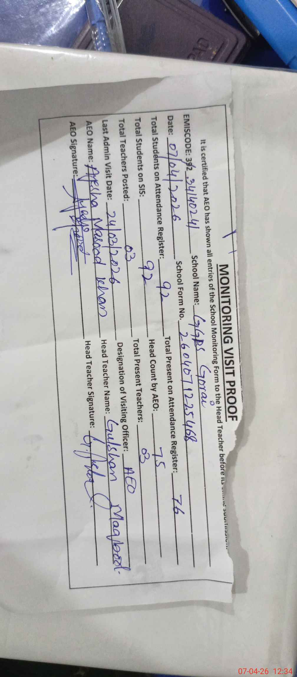 | Attendance Register | Head Teacher | MEA with School | Visit Proof |