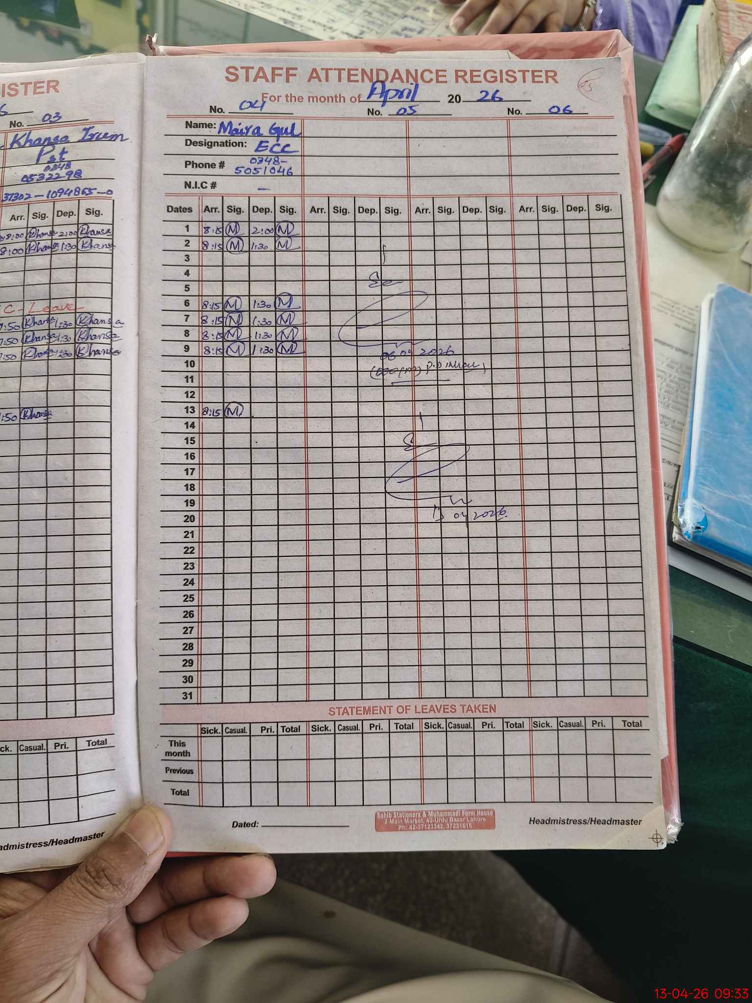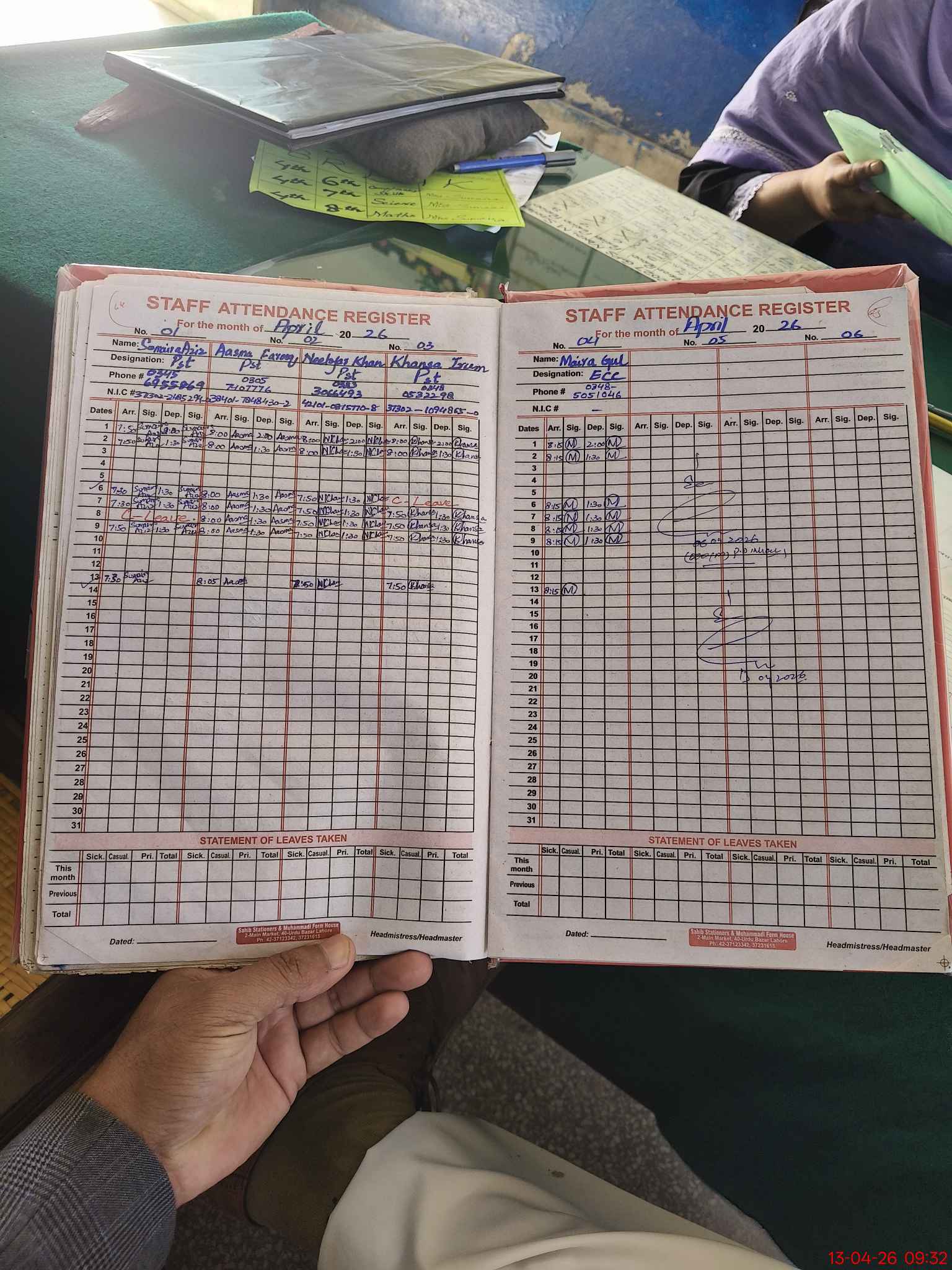 | CNIC | Full Name | Designation | R/C | Absence During Last Calender Month |