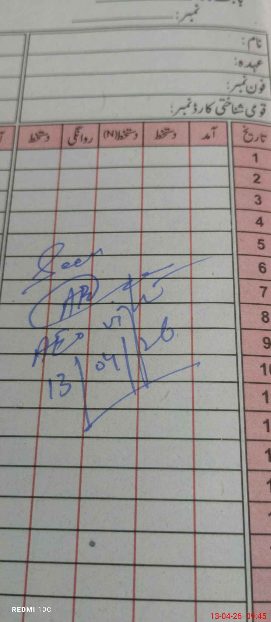 | CNIC | Full Name | Designation | R/C | Absence during last cal. month |