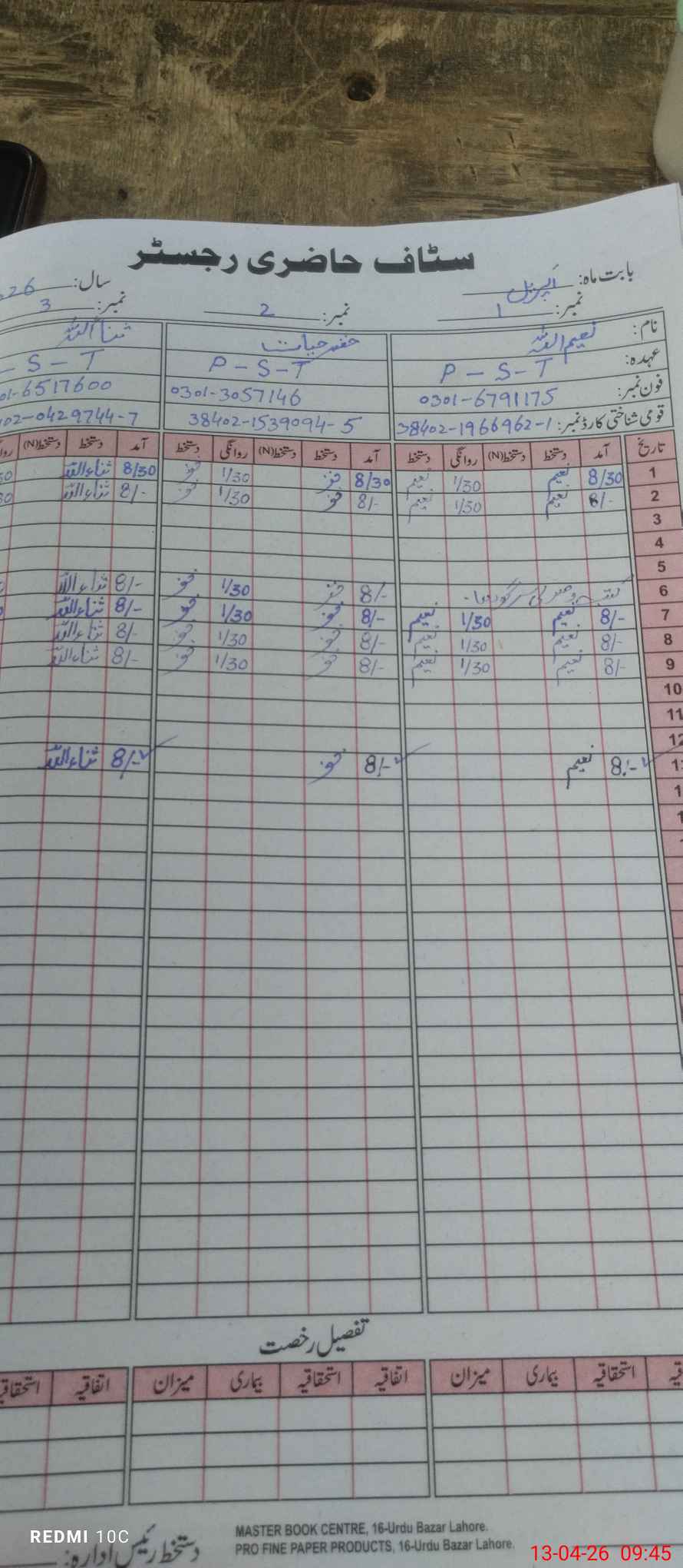 | CNIC | Full Name | Designation | R/C | Absence During Last Calender Month |