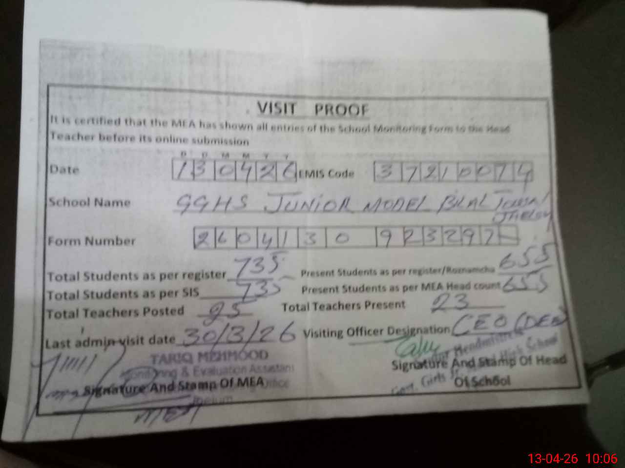| Certified that this School was Inspected by the Undersigned MEA/DMO Today and the Information Stated Above is as Per Record. | |||||