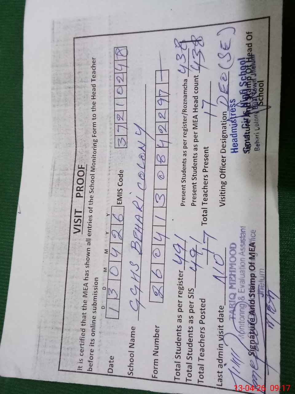 | Attendance Register | Head Teacher | MEA with School | Visit Proof |