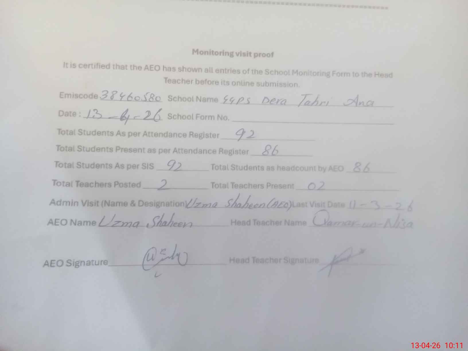 | Attendance Register | Head Teacher | MEA with School | Visit Proof |