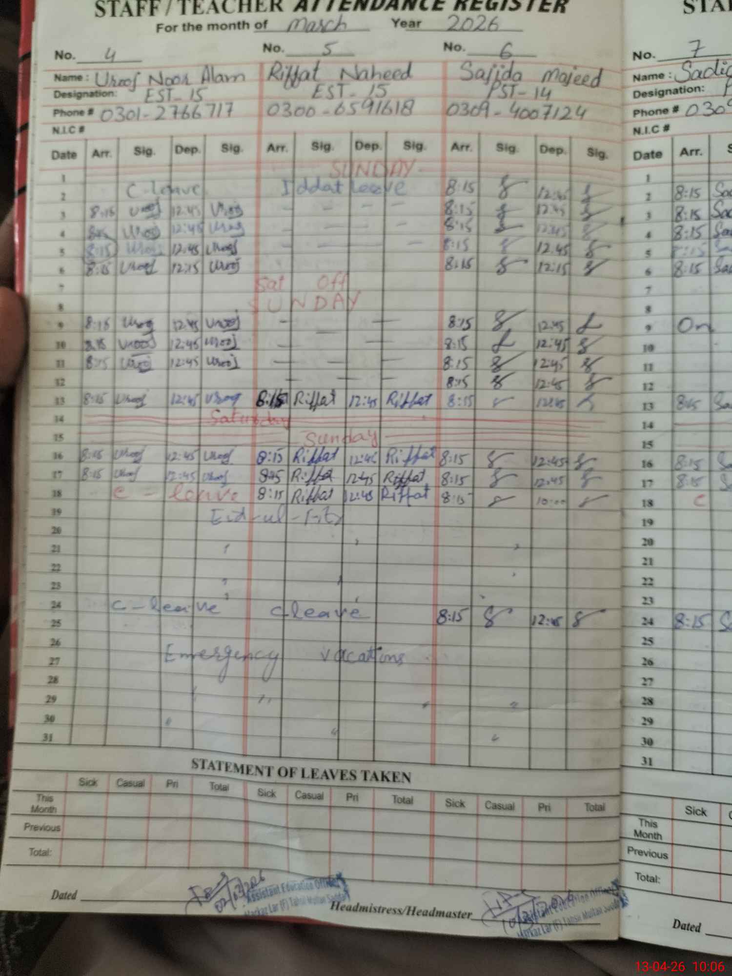 | 36**** | Sy**** Uz**** Ar**** | EST (Math) | Regular | 0 | 0 | 0 | 0 | 0 | 0 | 0 | 0 | 0 | Exam Duty |